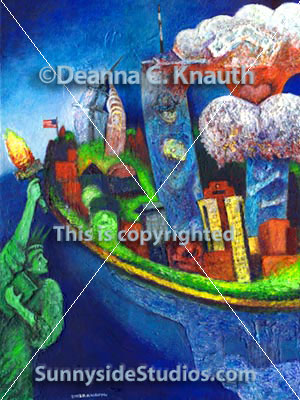 There was an exhibit at the Society of Illustrators about the "Prevailing Human Spirit" re: those events. I wanted to participate as an artist and funds were raised from the exhibit to help those affected. I wanted to contribute in some way and try to capture the essence of the tragedy and the closeness that people felt to each other during that time. Some people have commented that my painting on the web is not as clear as they would like. So I'm not sure if you can see it or not. The painting is slightly 3D in texture. I put a plane going into the Pentagon in the smoky clouds. In one building is a firefighter rescuing someone hurt. In the other, two people embrace to symbolize how the people in the building must have clung together at that time and yet also to show reassurance that we can get past this, which is why I put a heart above it. In all the tragedy, love is what will heal us and enable us to move on and rebuild from ourselves. The statue of liberty is the witness too far away to help or stop it from happening. Ironically, she always opened her doors to others and now she witnesses the horror and also greatness of humanity. In some buildings are people clinging together in grief or love or hope and the Chrysler Building and Empire State Building cling together to show how they're like the first bigger buildings in New York and like parents watching their children destroyed (and what could just as easily have been them).